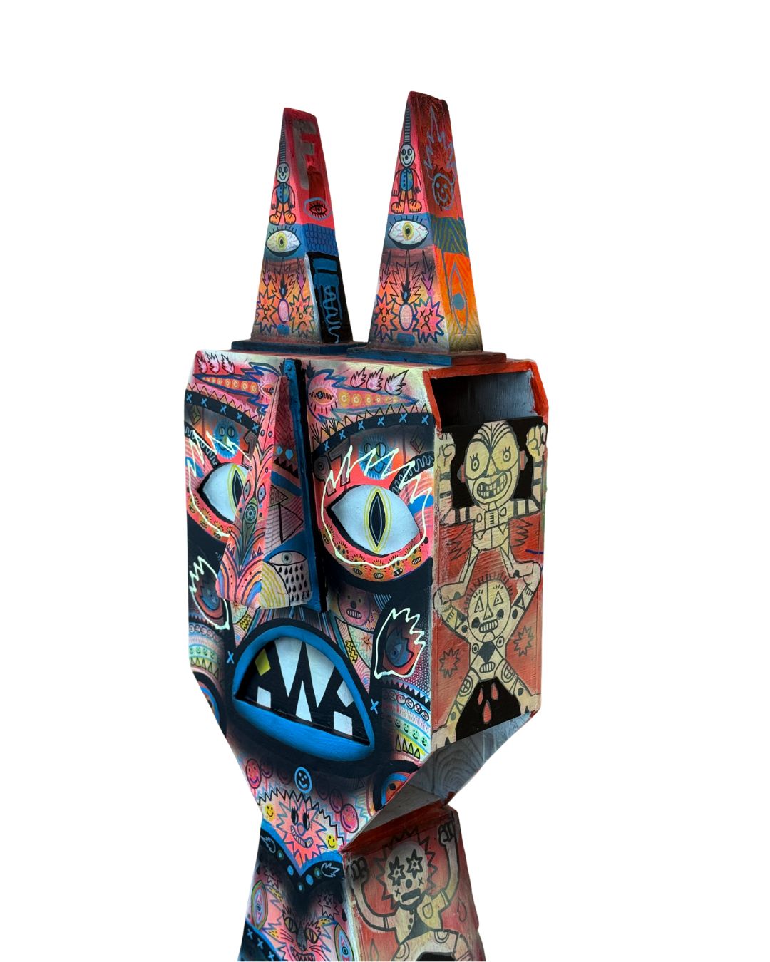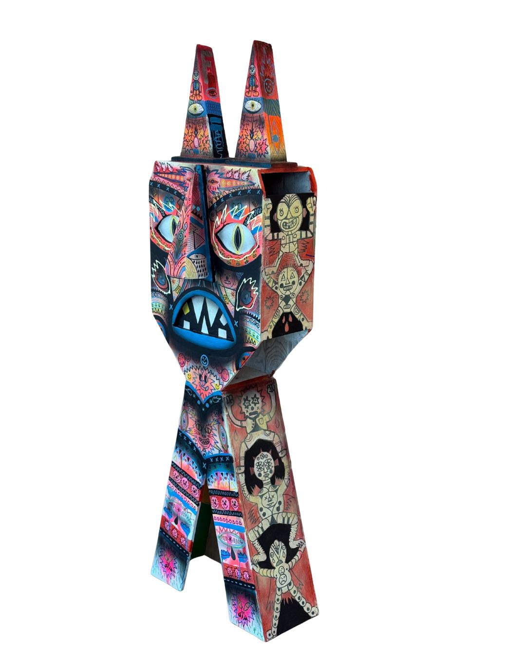 hand-painted wooden sculpture, painted on all sides with two different moods, front and back. Roughly 63"x18"x8"
