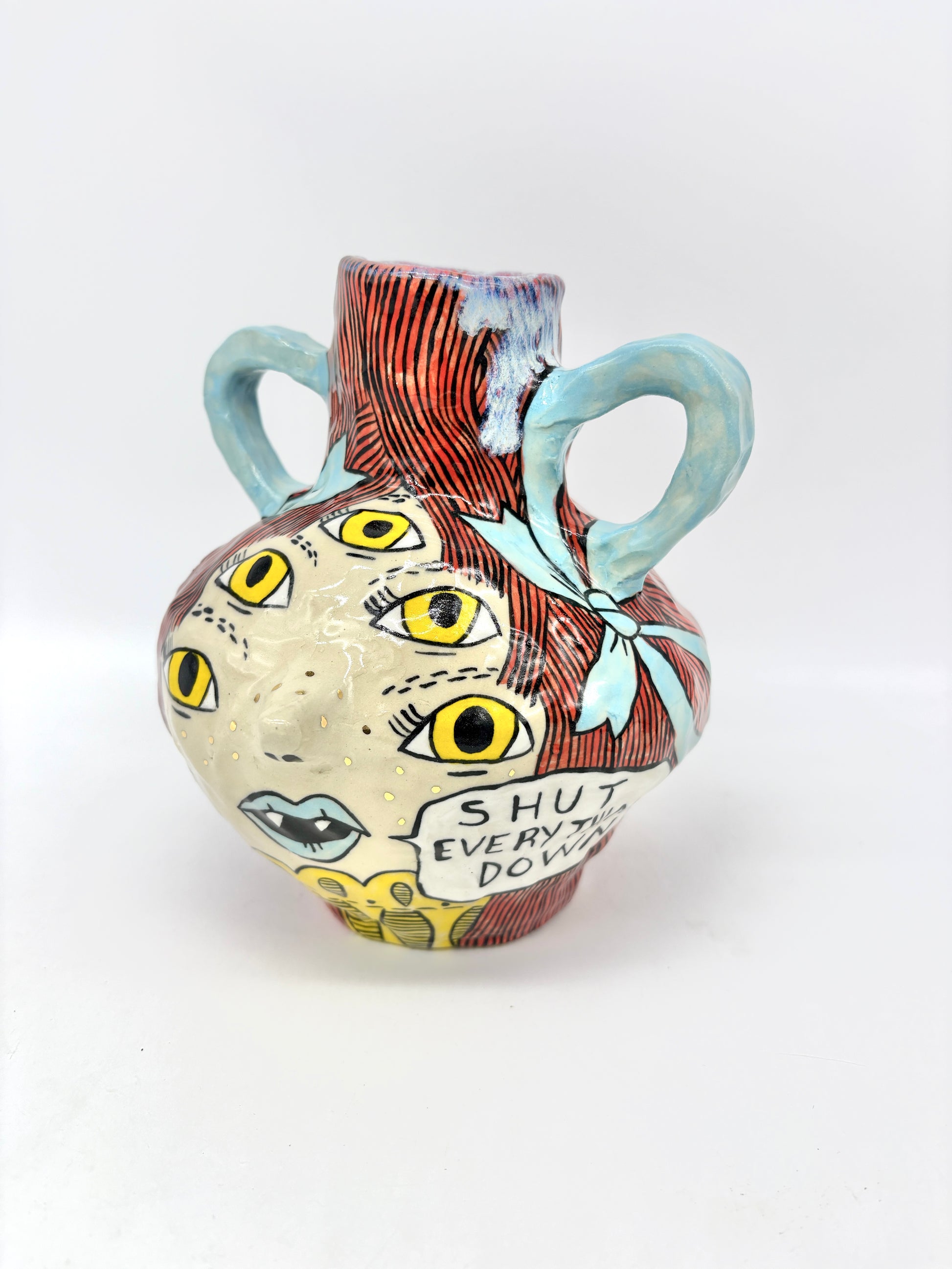 Stoneware, underglaze, glaze, 22k gold luster; 5.5” x 5.5” x 6.25”