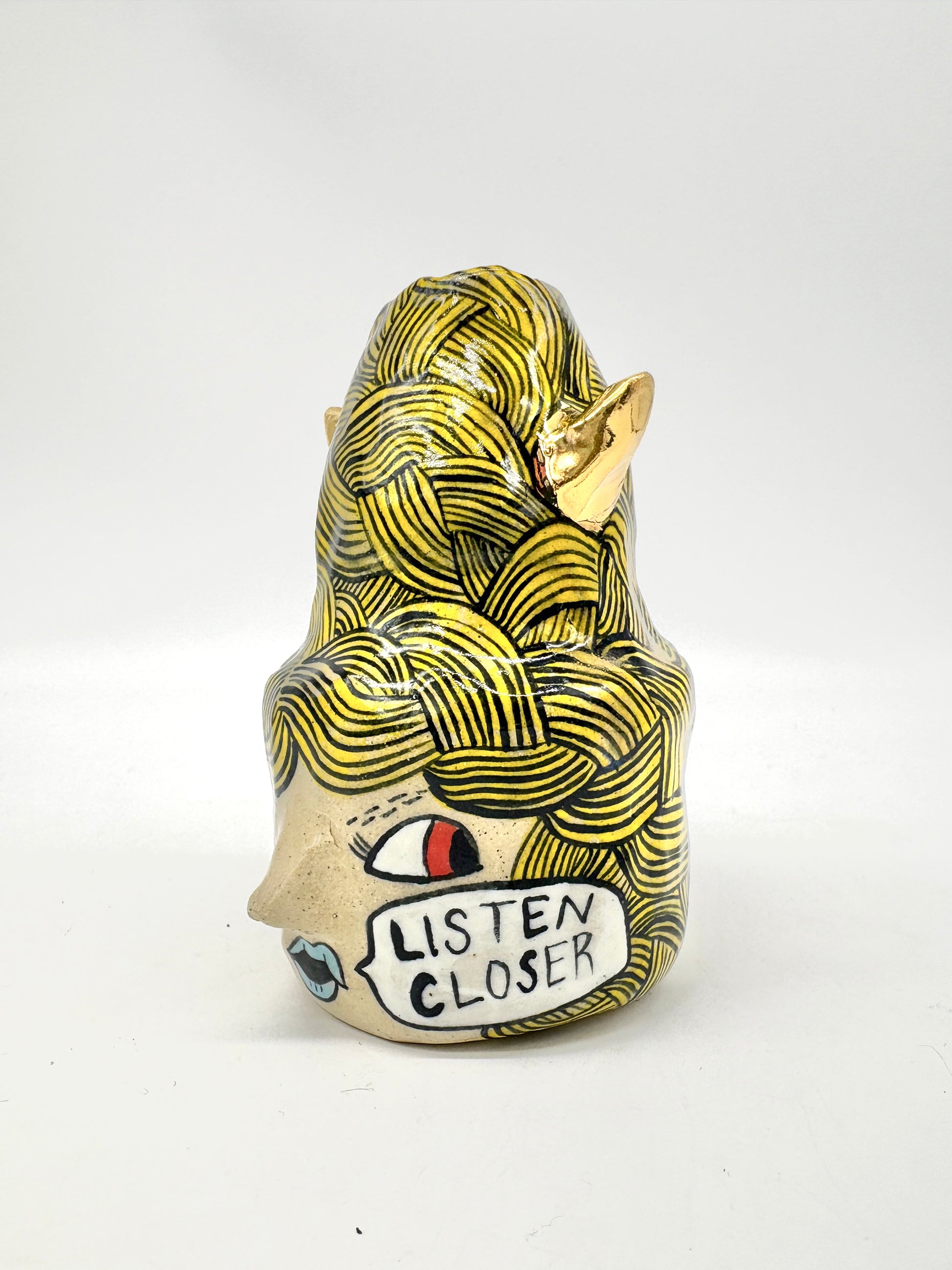 Stoneware, underglaze, glaze, 22k gold luster; 2.75” x 2.5” x 4”