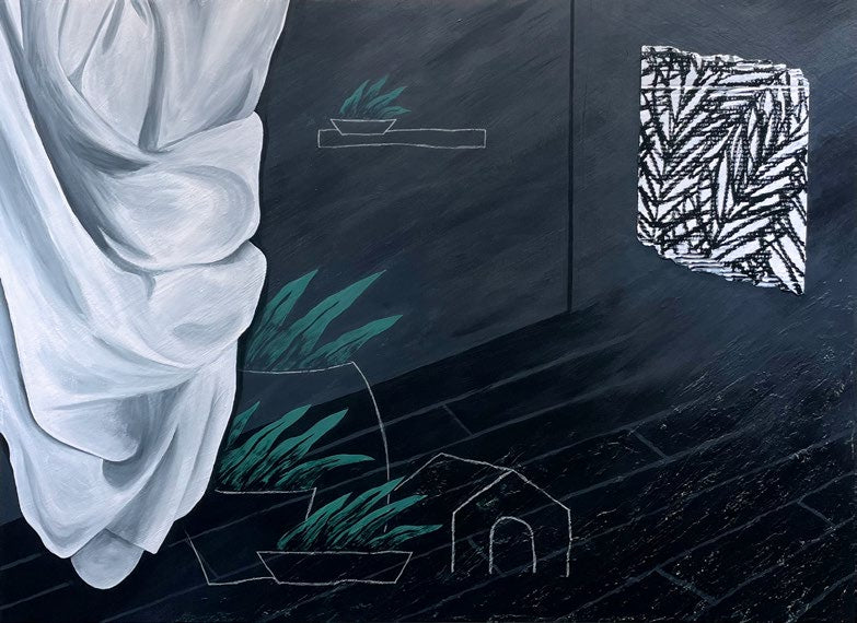 Acrylic, white charcoal, & found material on a handmade wood panel.