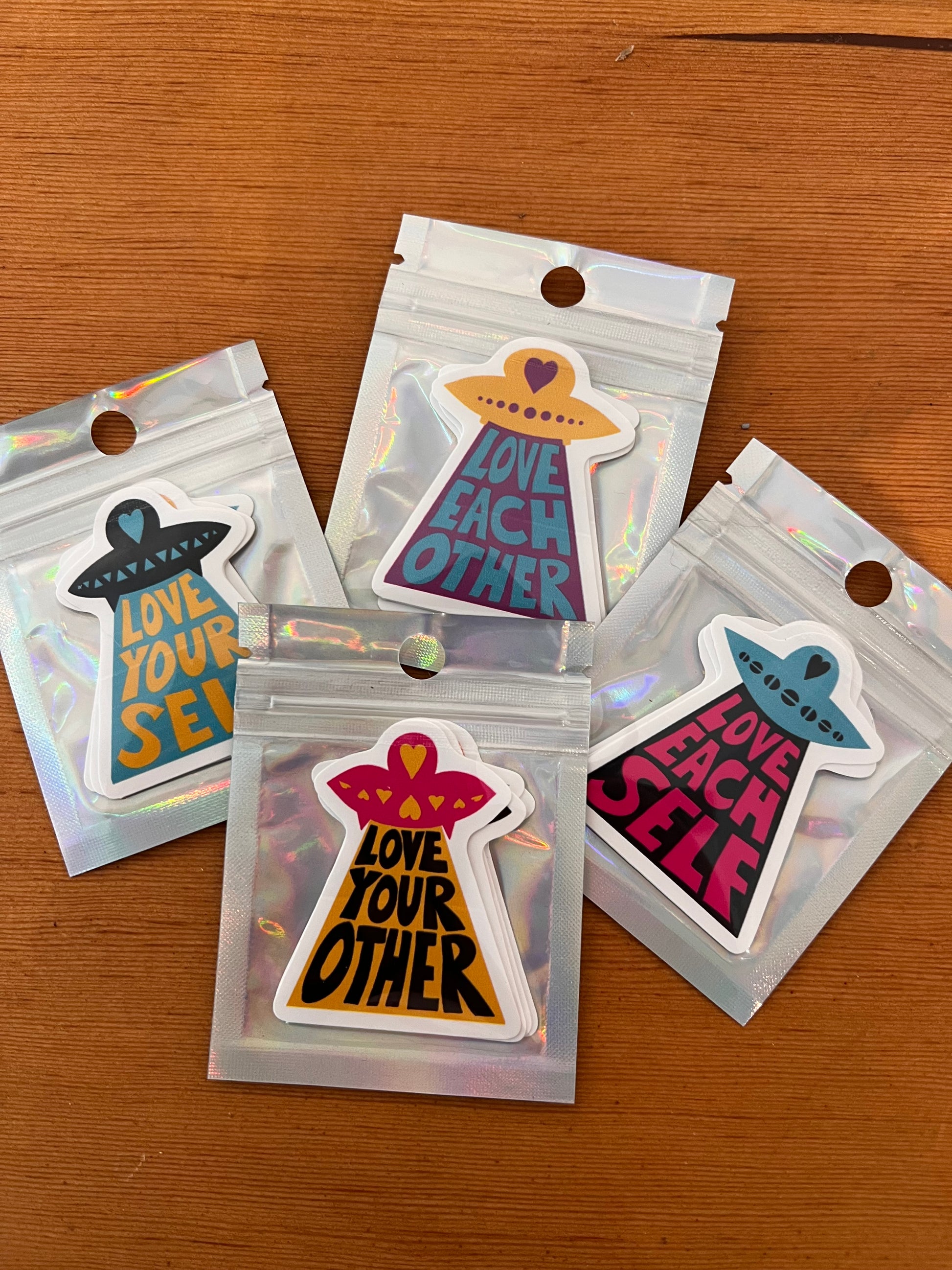All FOUR of Larry Peace Love Yes’s Soaceship vinyl stickers in a pack. Stickers are water-proof, 2” tall