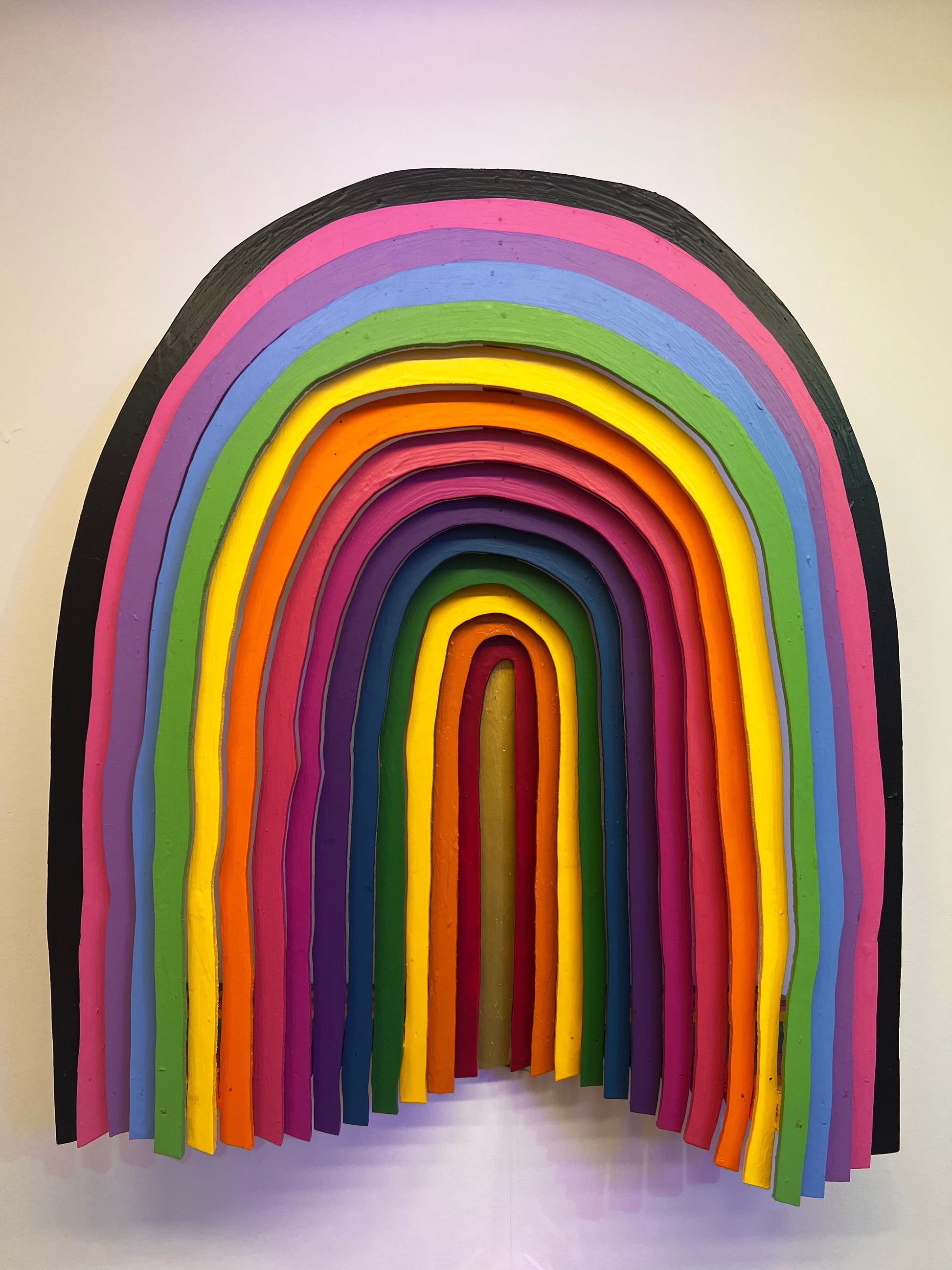 23x20x7" 3D wooden rainbow with acrylic paint.