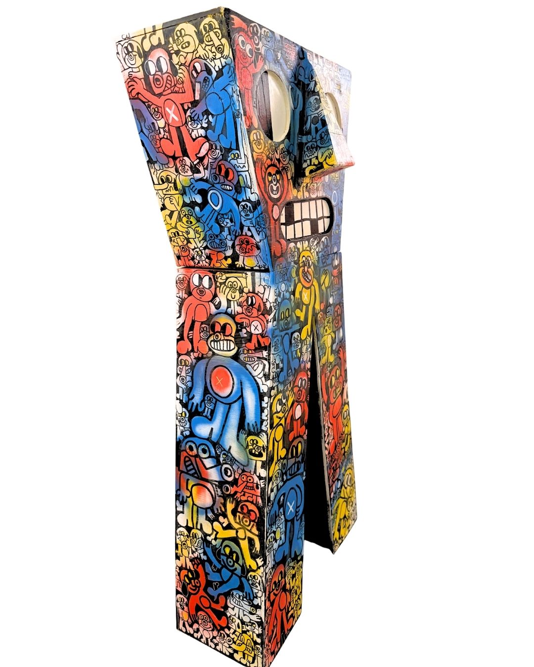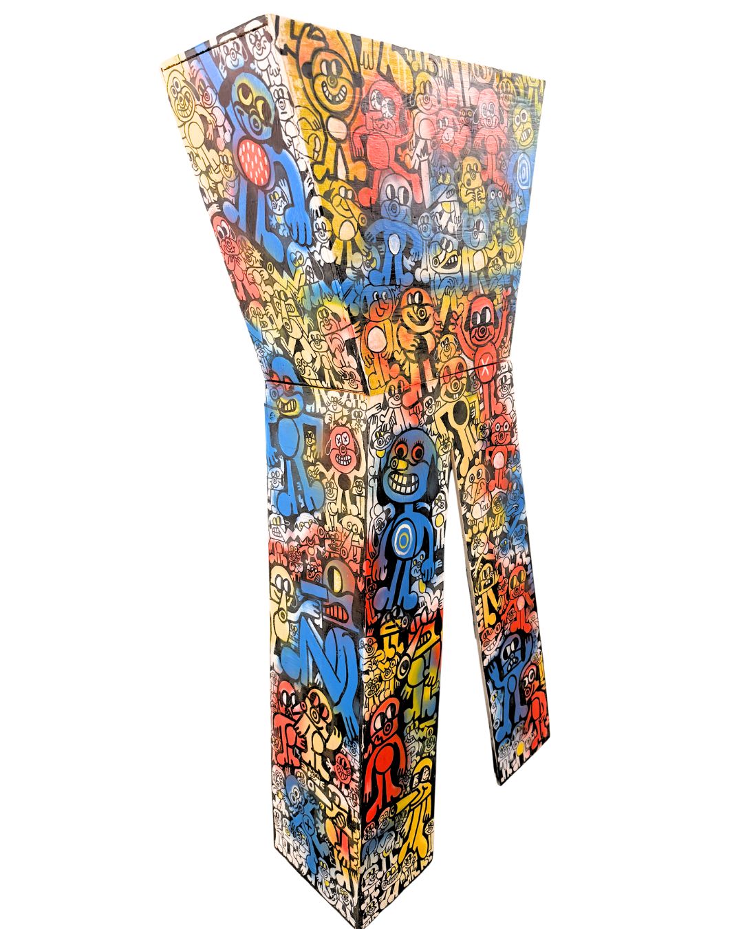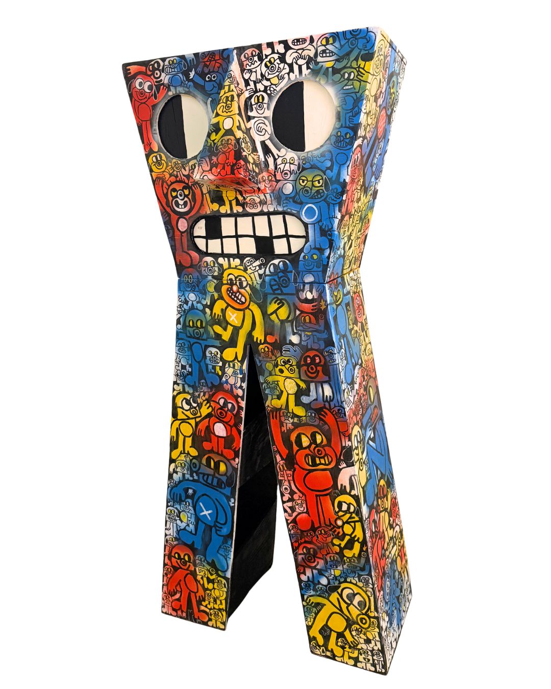hand-painted wooden sculpture, painted on all sides, front and back shown here. Roughly 72"x30"x14"